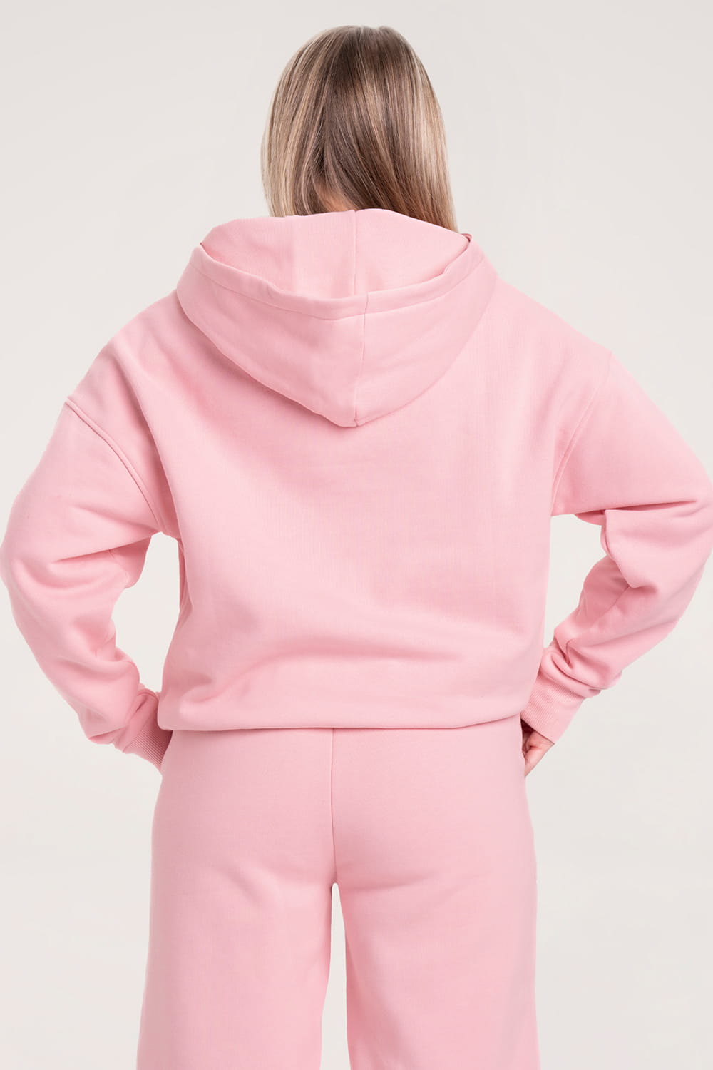 Oversize rožinis džemperis “College” su gobtuvu.