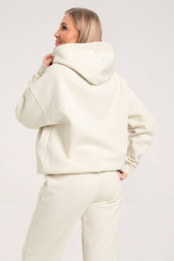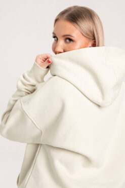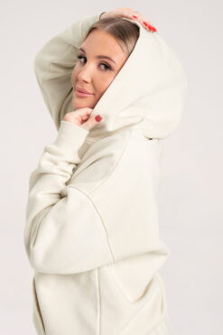 Oversize baltas džemperis “College” su gobtuvu.