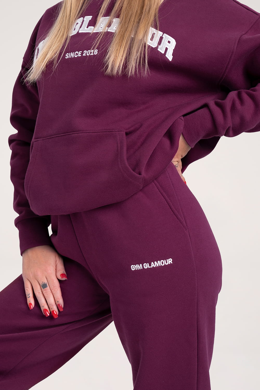 - Stilingos detalės – klešnių apačia su raišteliais ir subtilus, išsiuvinėtas Gym Glamour logotipas.