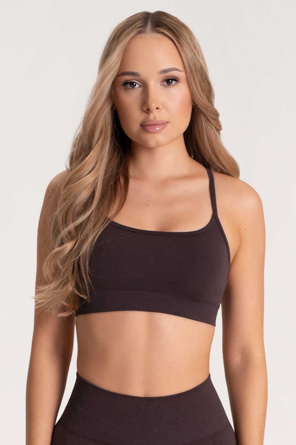 Minimalistinė rudos spalvos patogi sportinė liemenėlė, sukurta užtikrinti aukštą dėvėjimo komfortą kasdienės veiklos ir treniruočių metu.