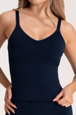 Minimalistinis tamsiai mėlynos spalvos patogus sportinis liemenėlės tipo topas su pailgintu modeliu, užtikrinantis didesnį krūtinės prilaikymą ir aukštą dėvėjimo komfortą.