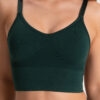 Minimalistinis tamsiai žalios spalvos patogus sportinis liemenėlės tipo topas su pailgintu liemeniu, užtikrinantis gerą krūtinės prilaikymą ir aukštą dėvėjimo komfortą.